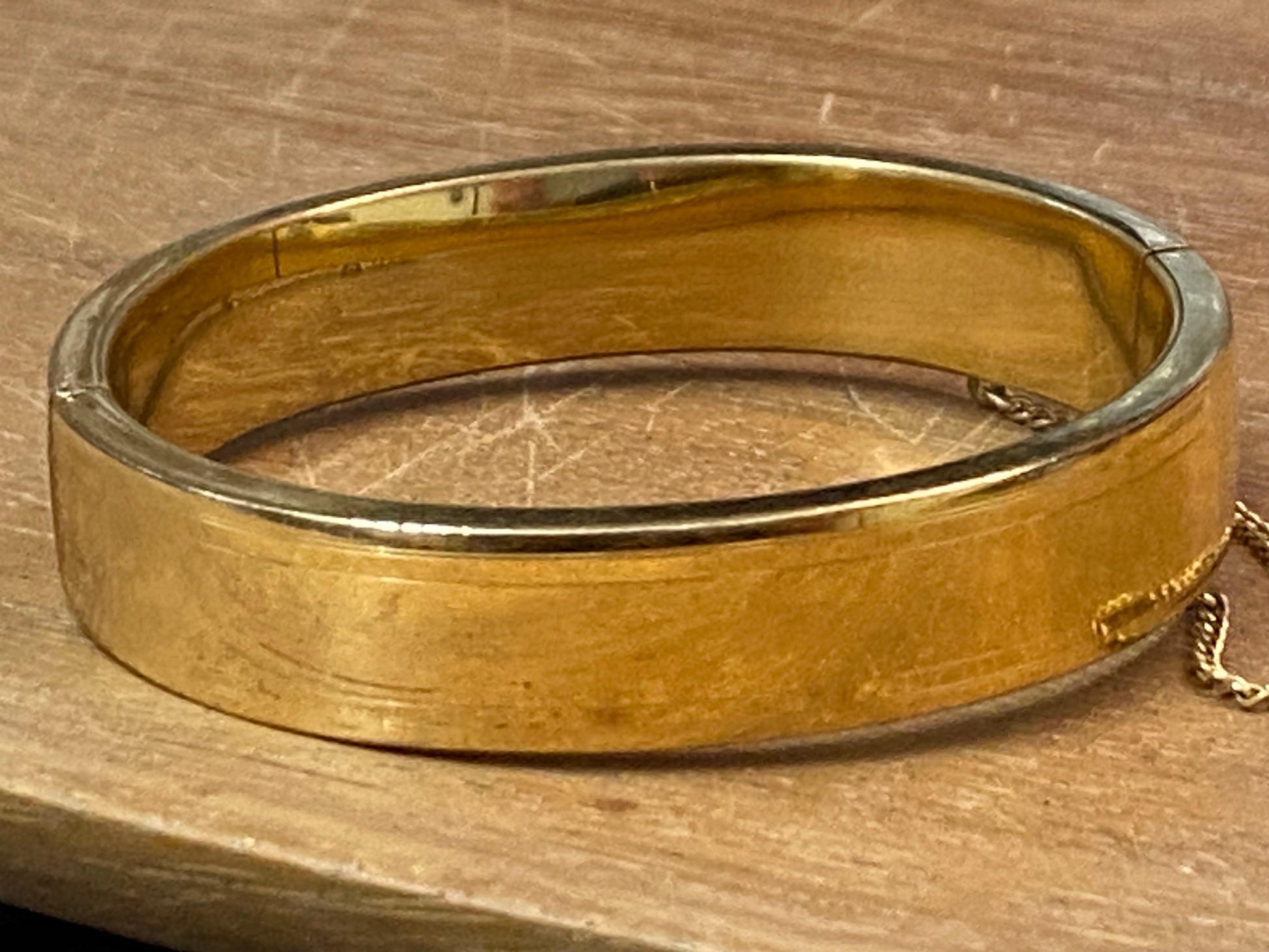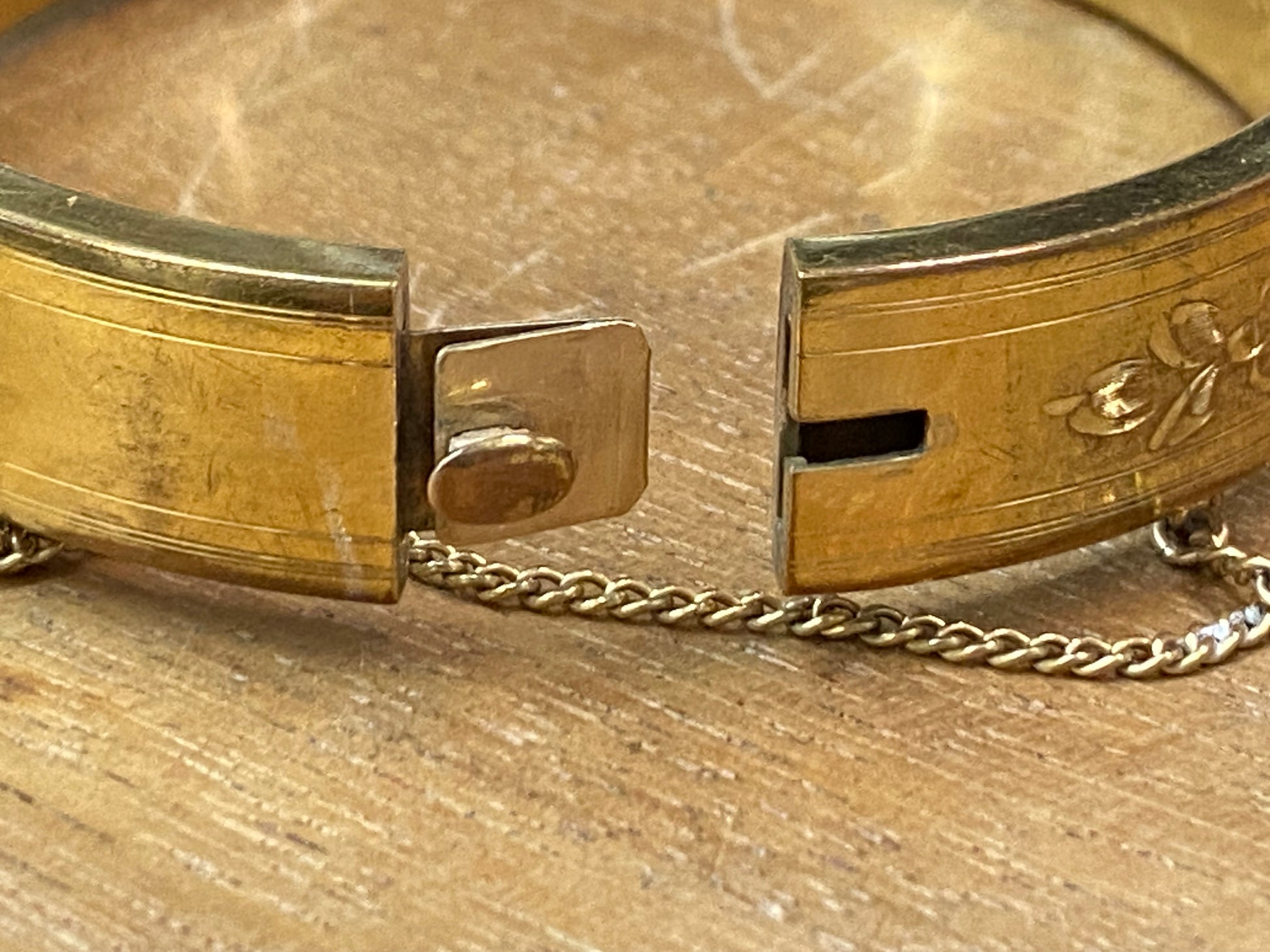 Description : Vintage etched 12k gold cuff with security chain and v-latch. Some wear on the clasp button and around the cuff consistent with age.