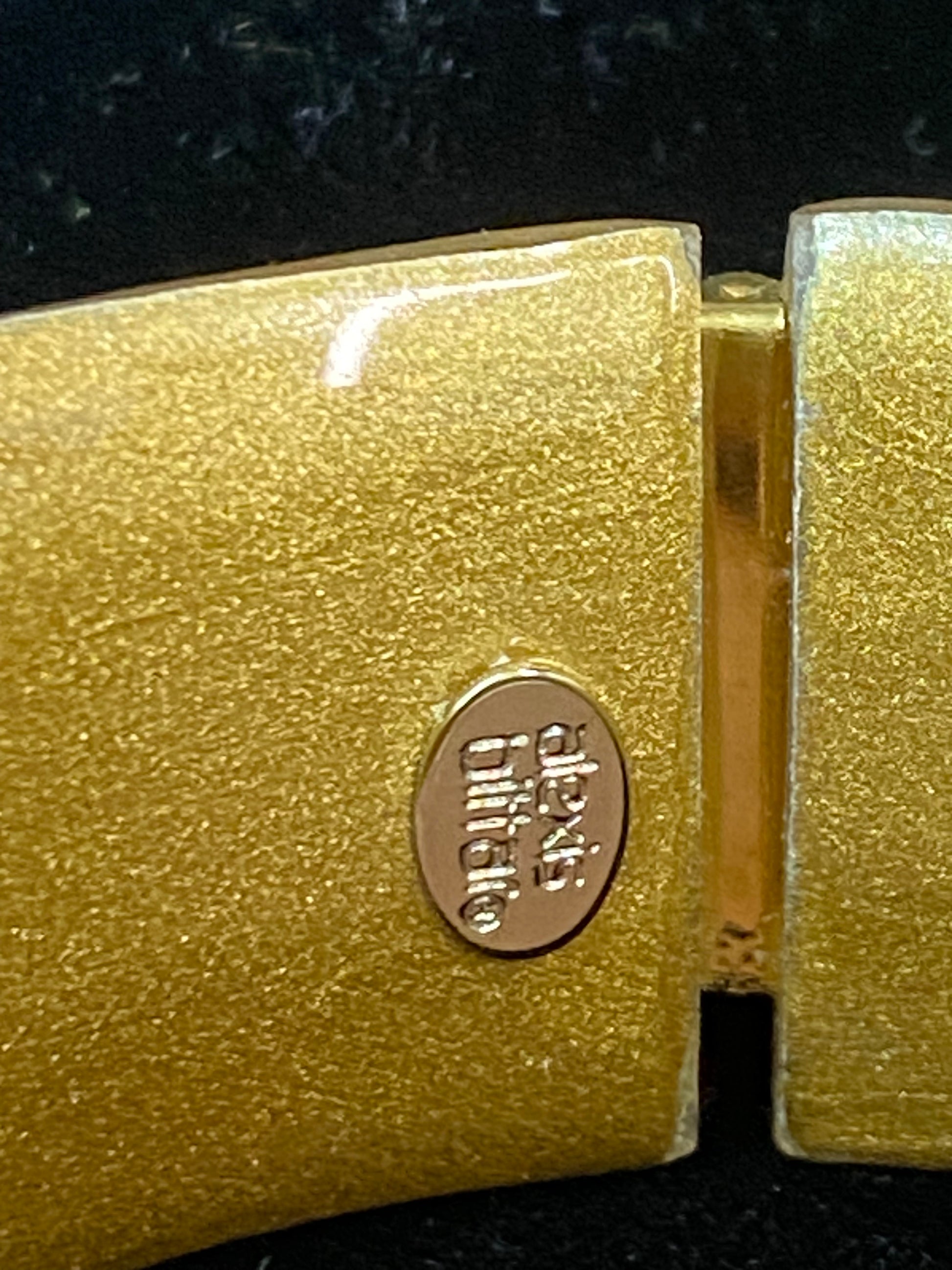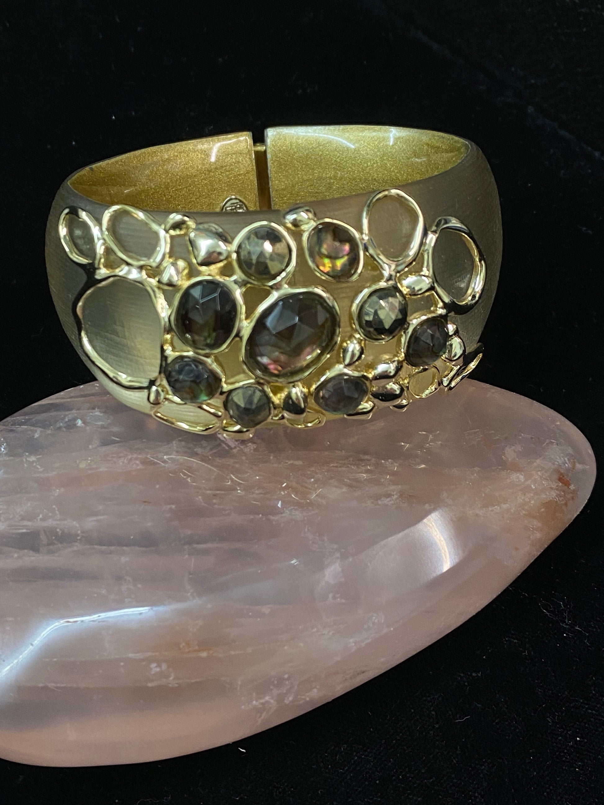 Description : Alexis Bittar large lucite cuff, champagne color. Includes black mother of pearl, pyrite, and gold plating. Originally around $400.