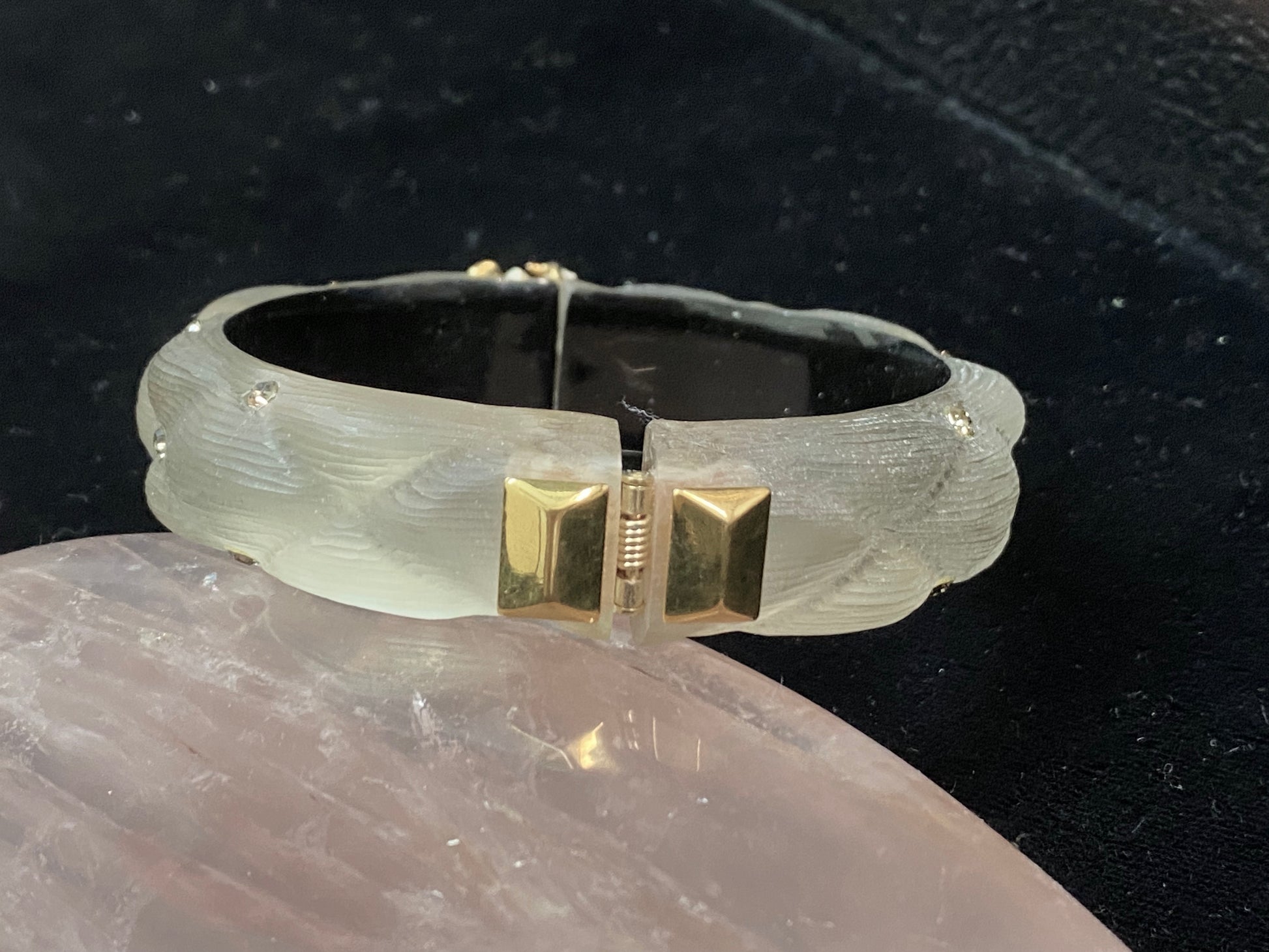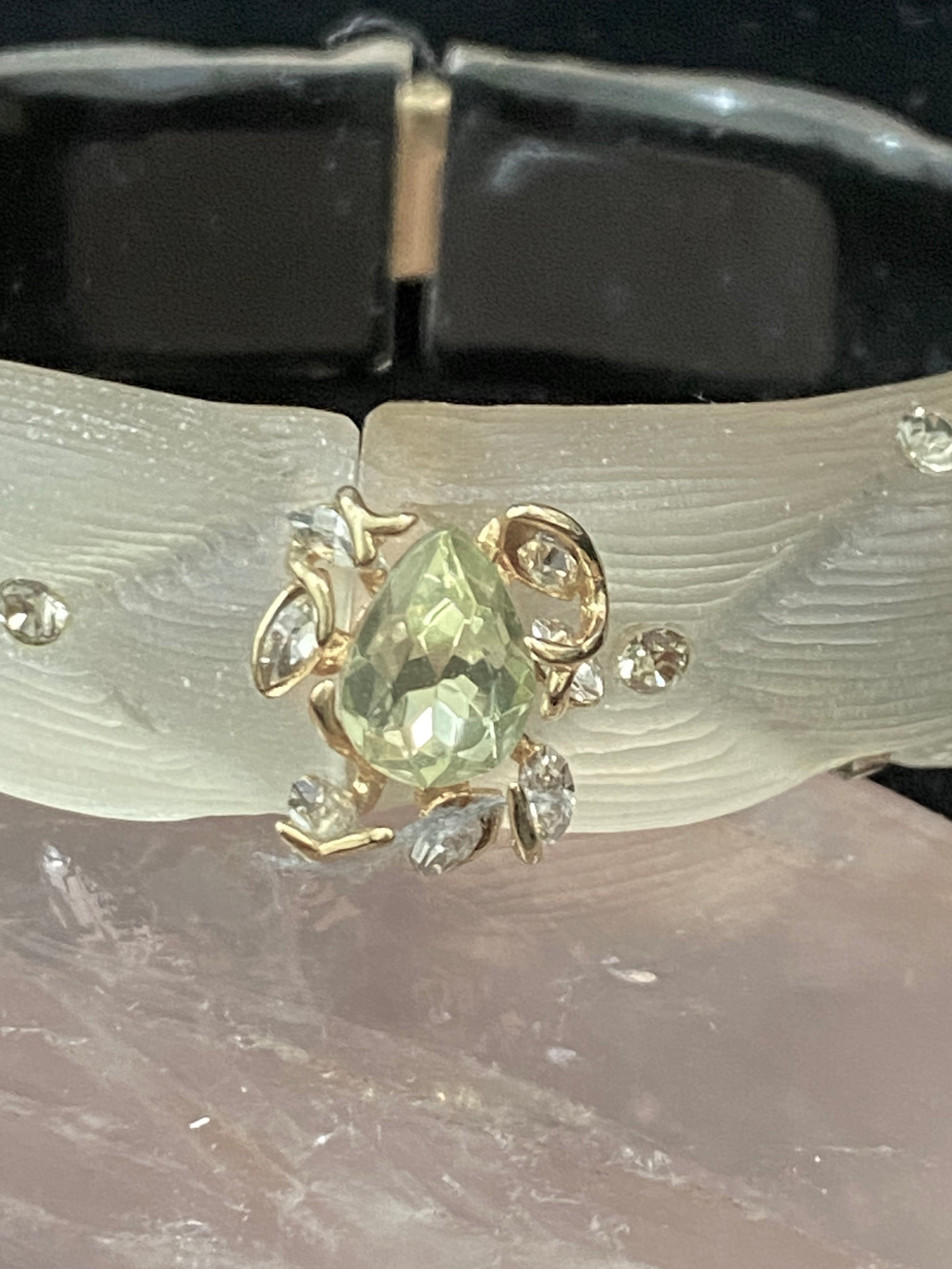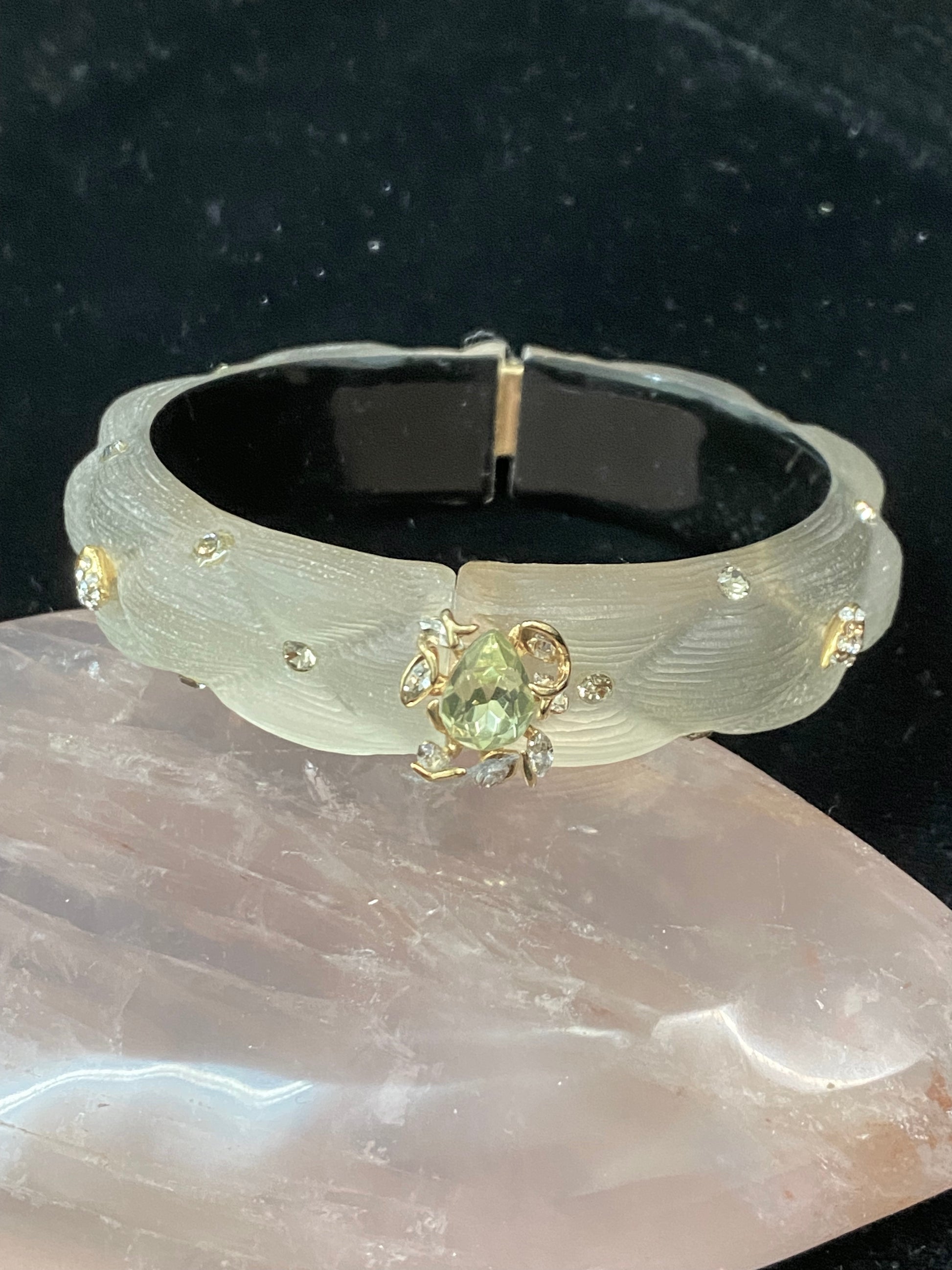 Description : Alexis Bittar hinged quilted cuff bracelet with quartz crystals and peridot(?) and gold plated accents. $345 new.