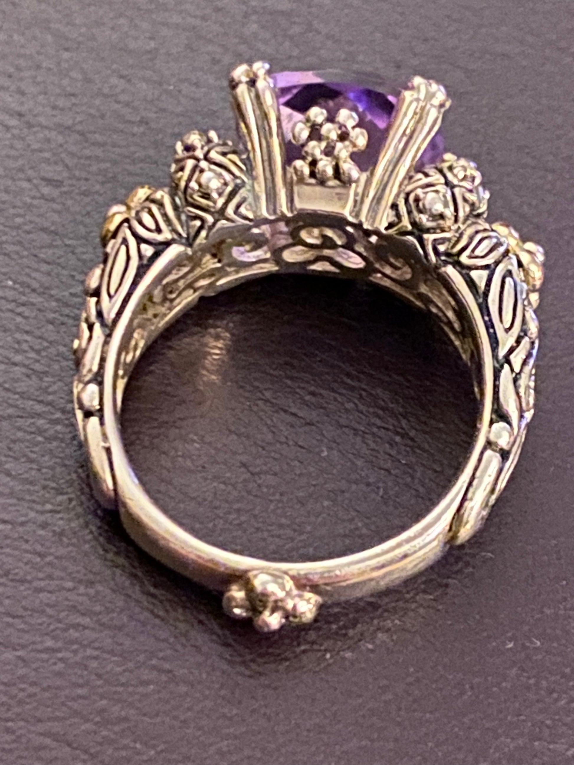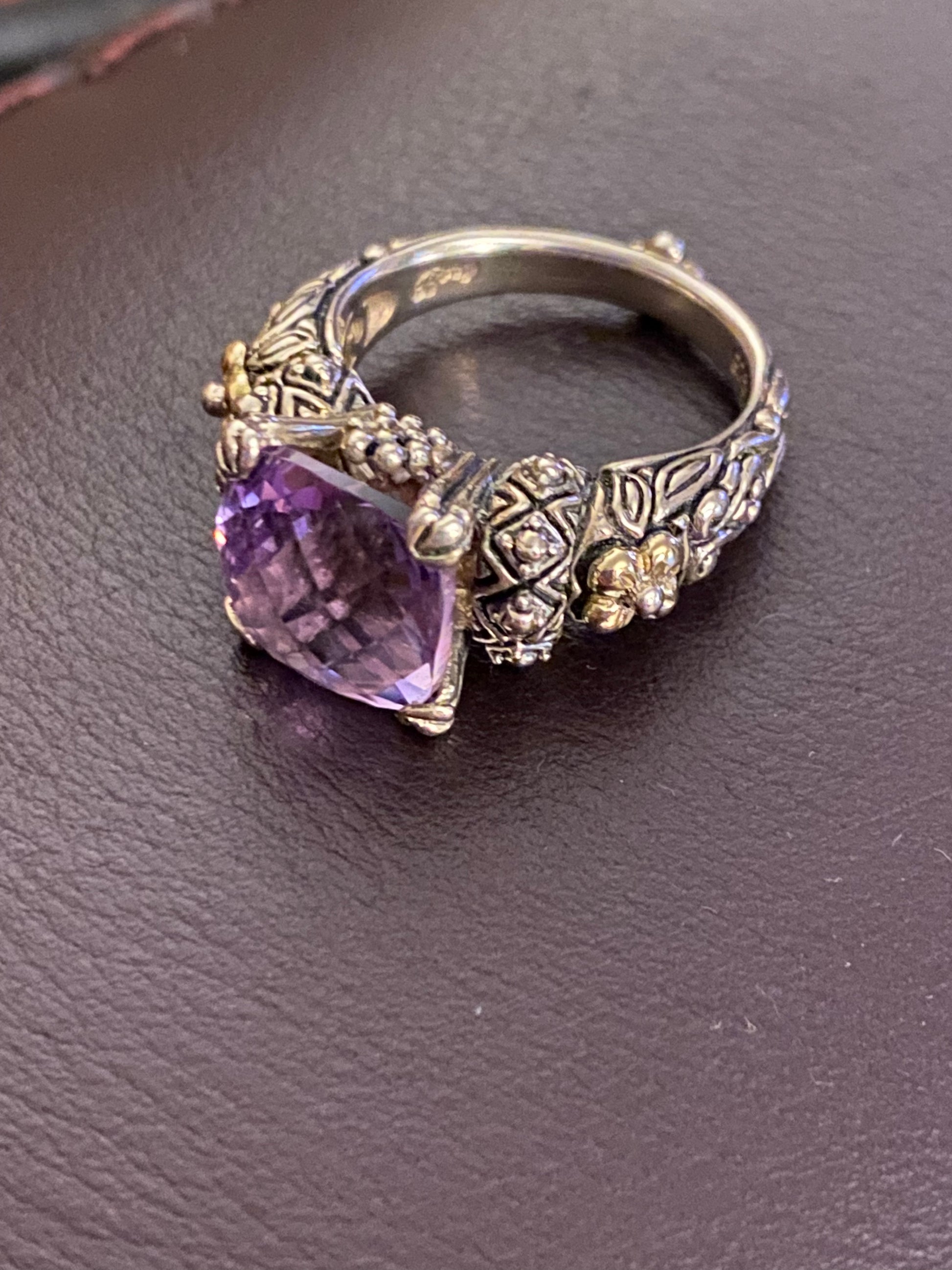 Description : Beautiful size 7 cocktail ring from designer Barbara Bixby. Made from 925 silver, 18k gold accents, and a large cushion-cut amethyst.