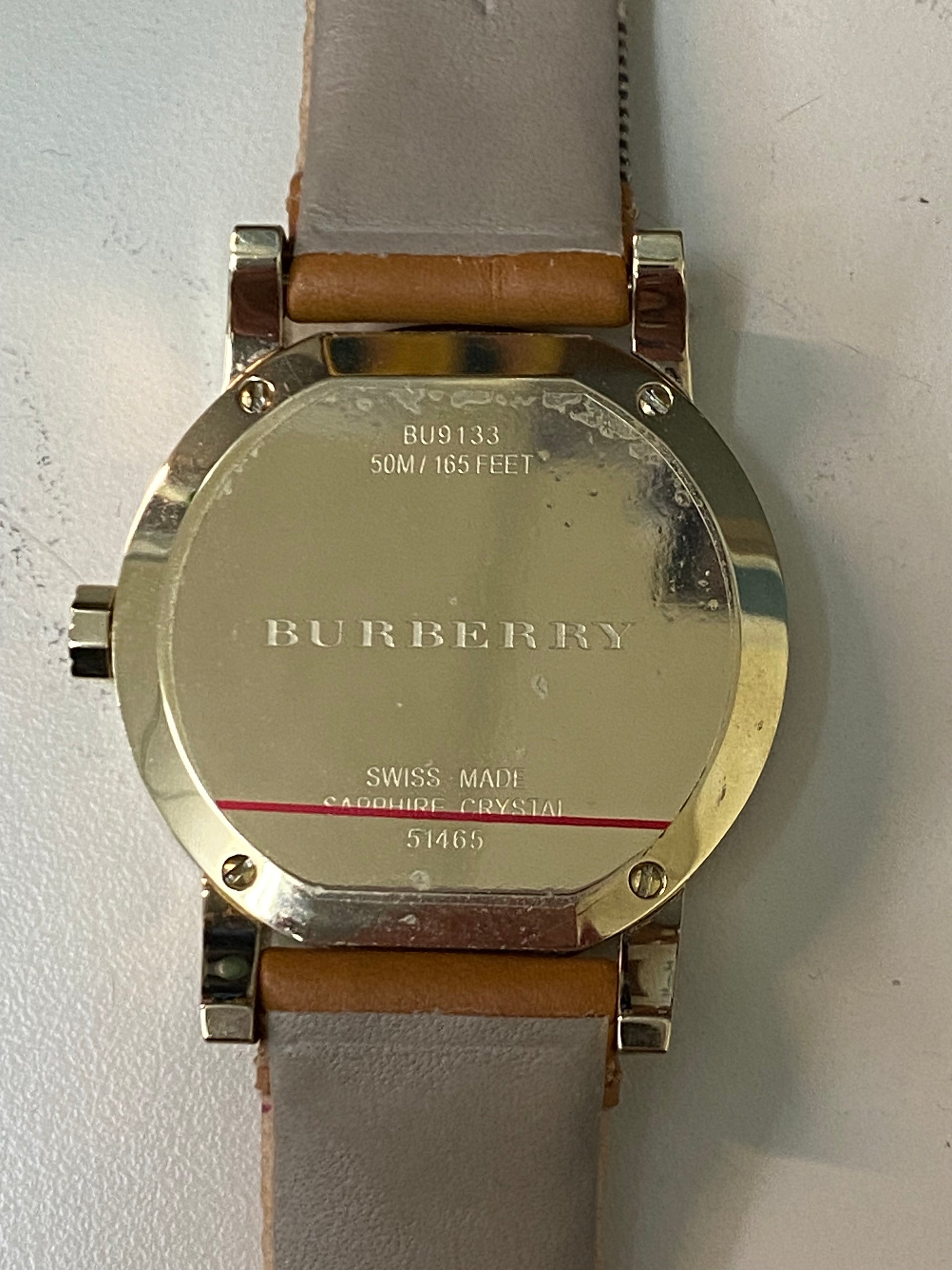 Description : Burberry Champagne Yellow Gold Plated Stainless Steel Leather The City BU9133 Women's Wristwatch 35 mm; "Burberrys" is the historical brand whereas "Burberry" was a short-lived branding that was used after 1999.