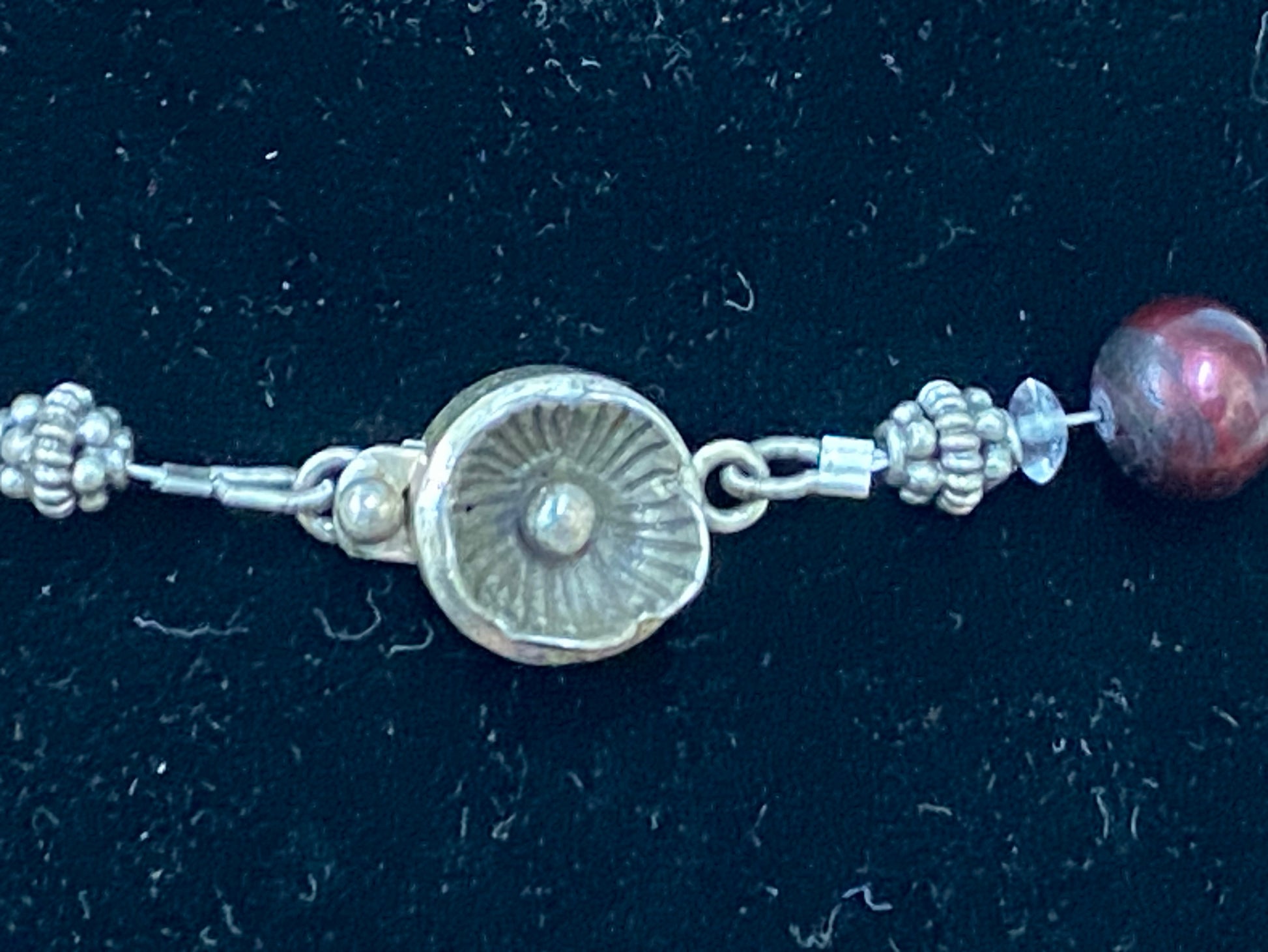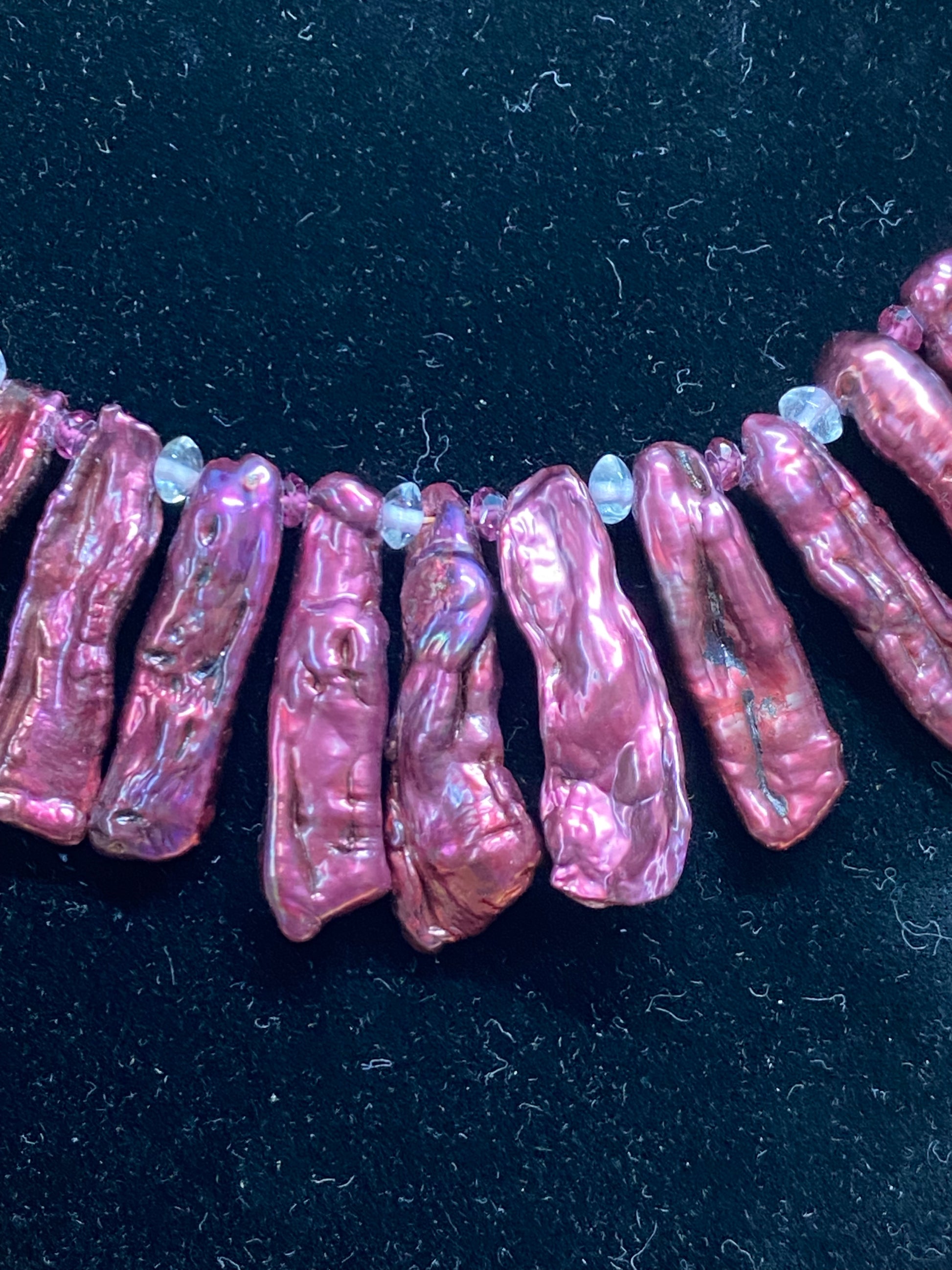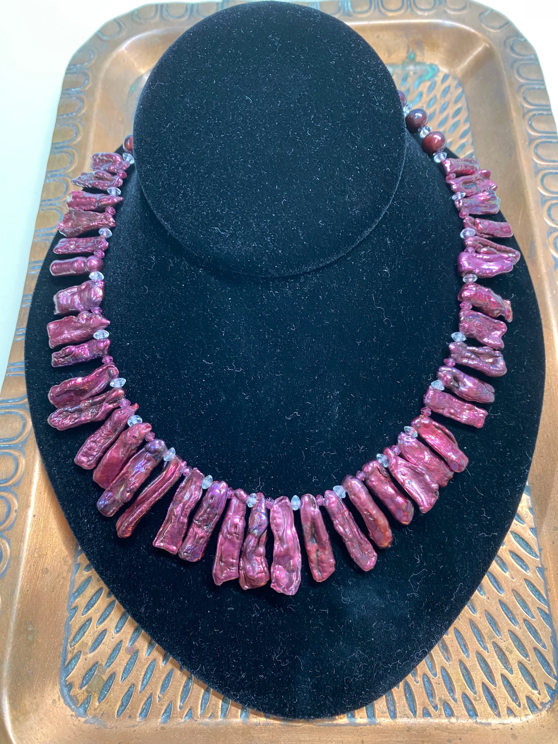 Description : Gorgeous burgundy "stick" pearls are separated by crystal spacers and finished with a handmade flower spring clasp in 925 silver. Total 10" drop from neck. Must see - pictures can't do it justice.