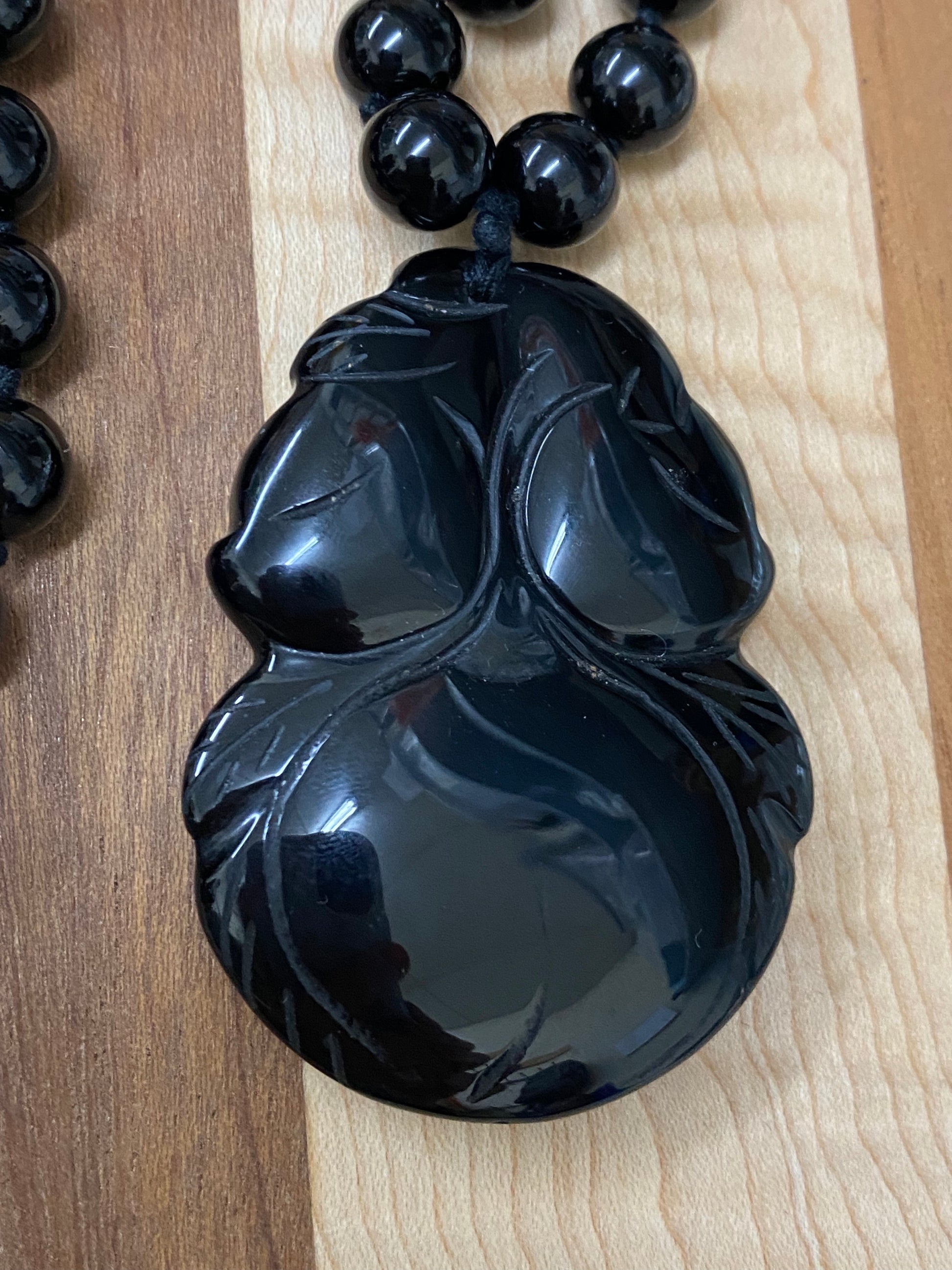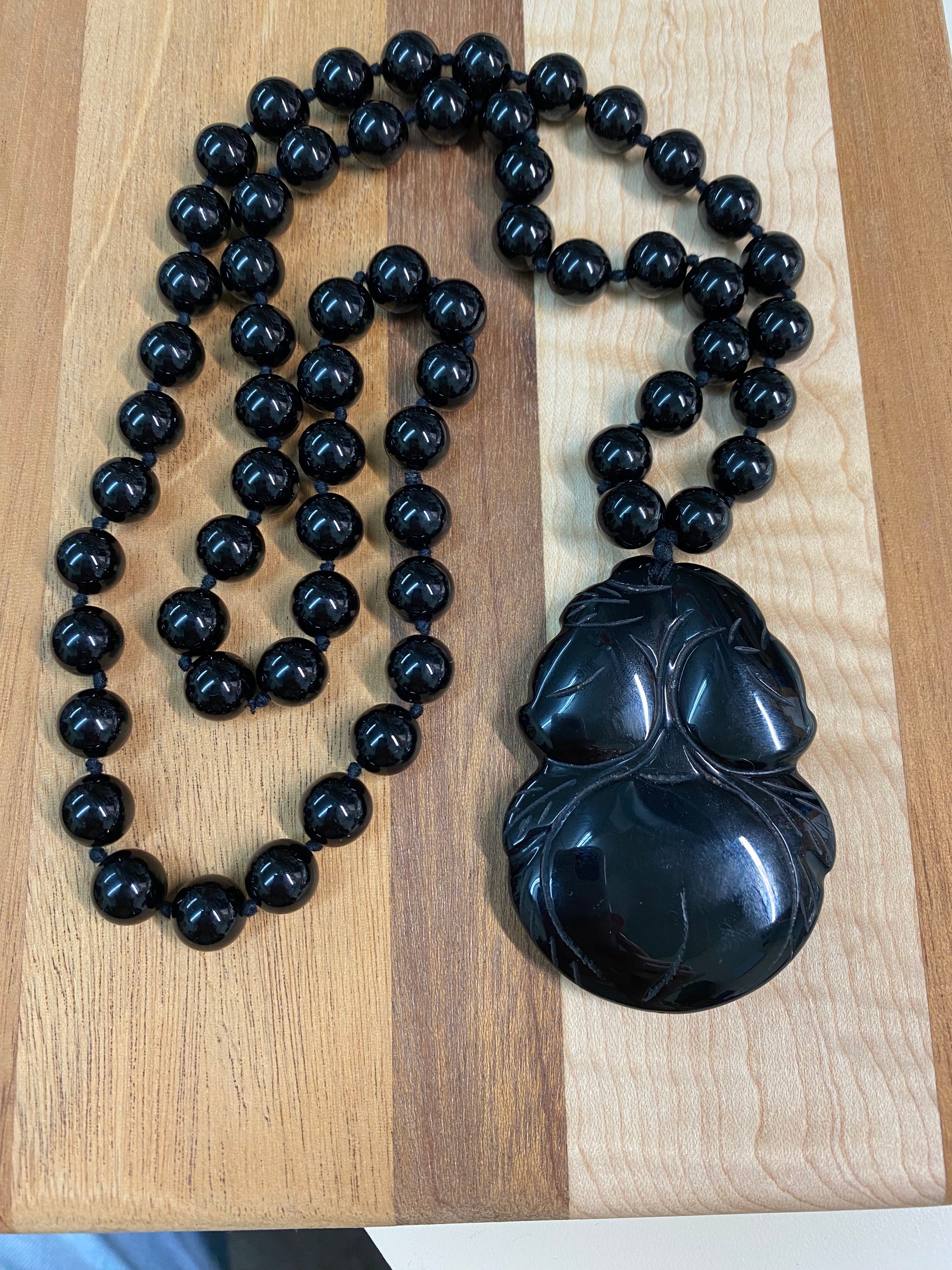 Description : Vintage carved Chinese black onyx (maybe jade?). Hand knotted beaded necklace.