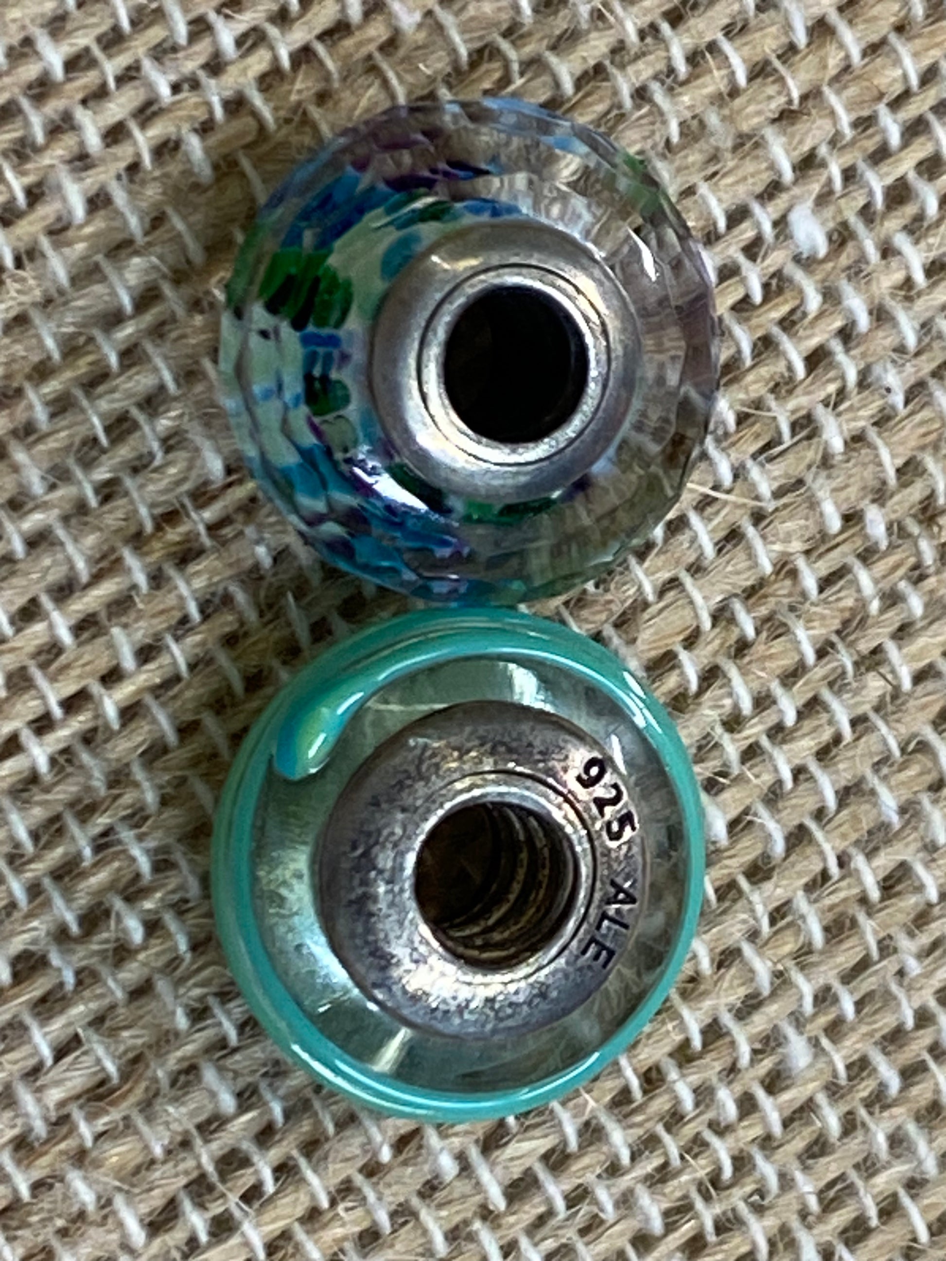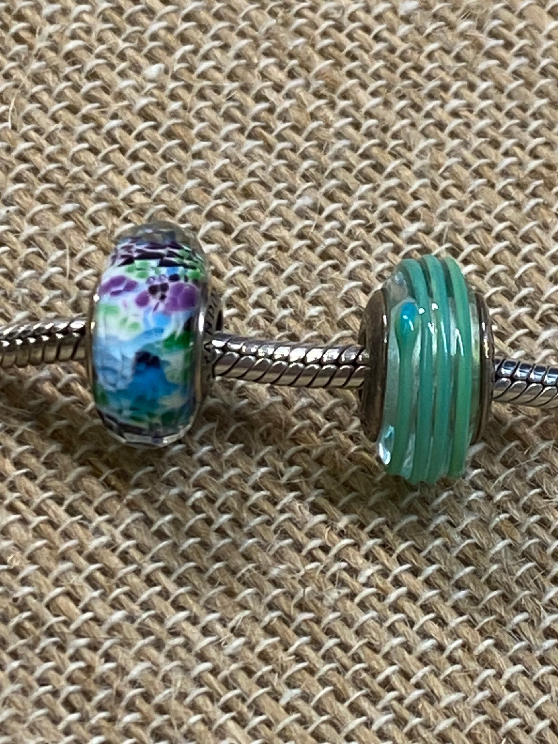 Description : PANDORA Murano glass charms give your bracelet some color and sass. One in faceted multi-color, and one in striped green.