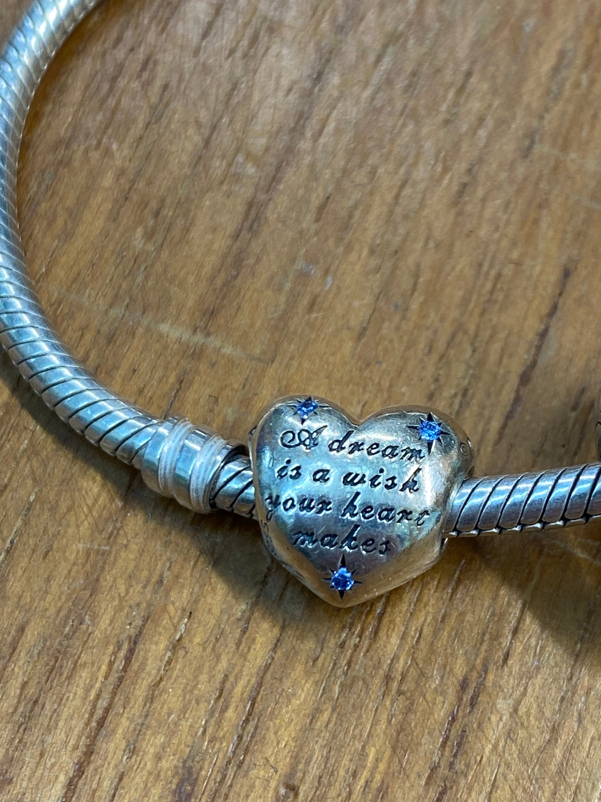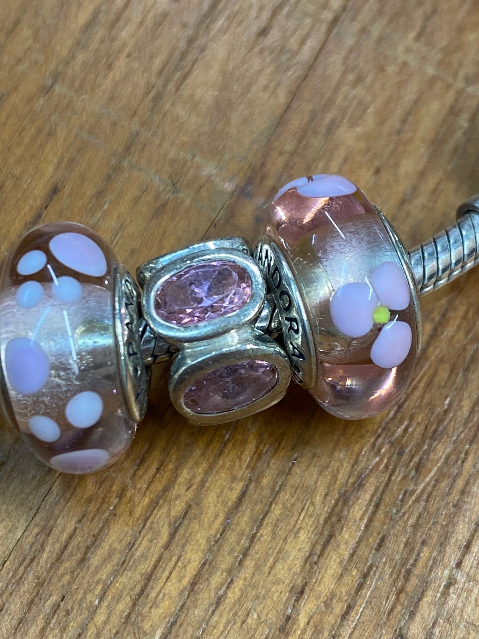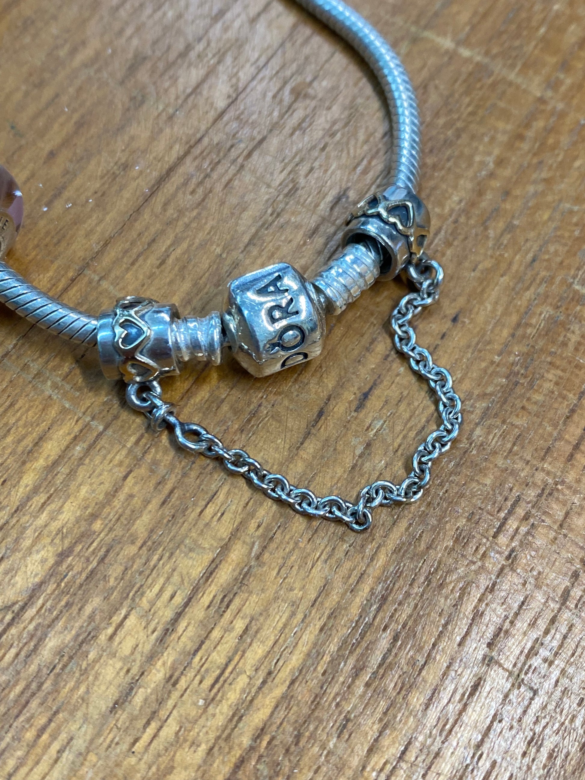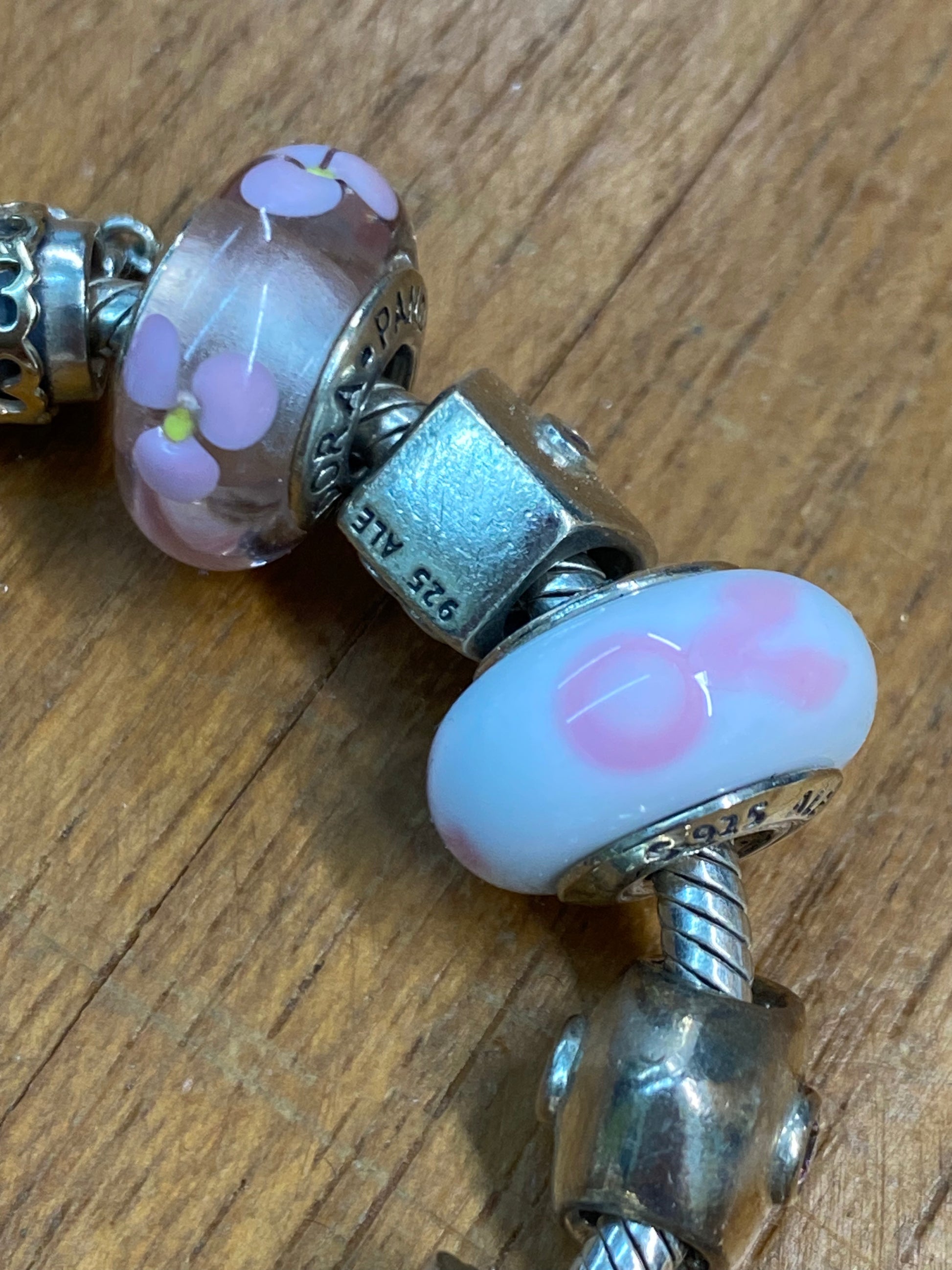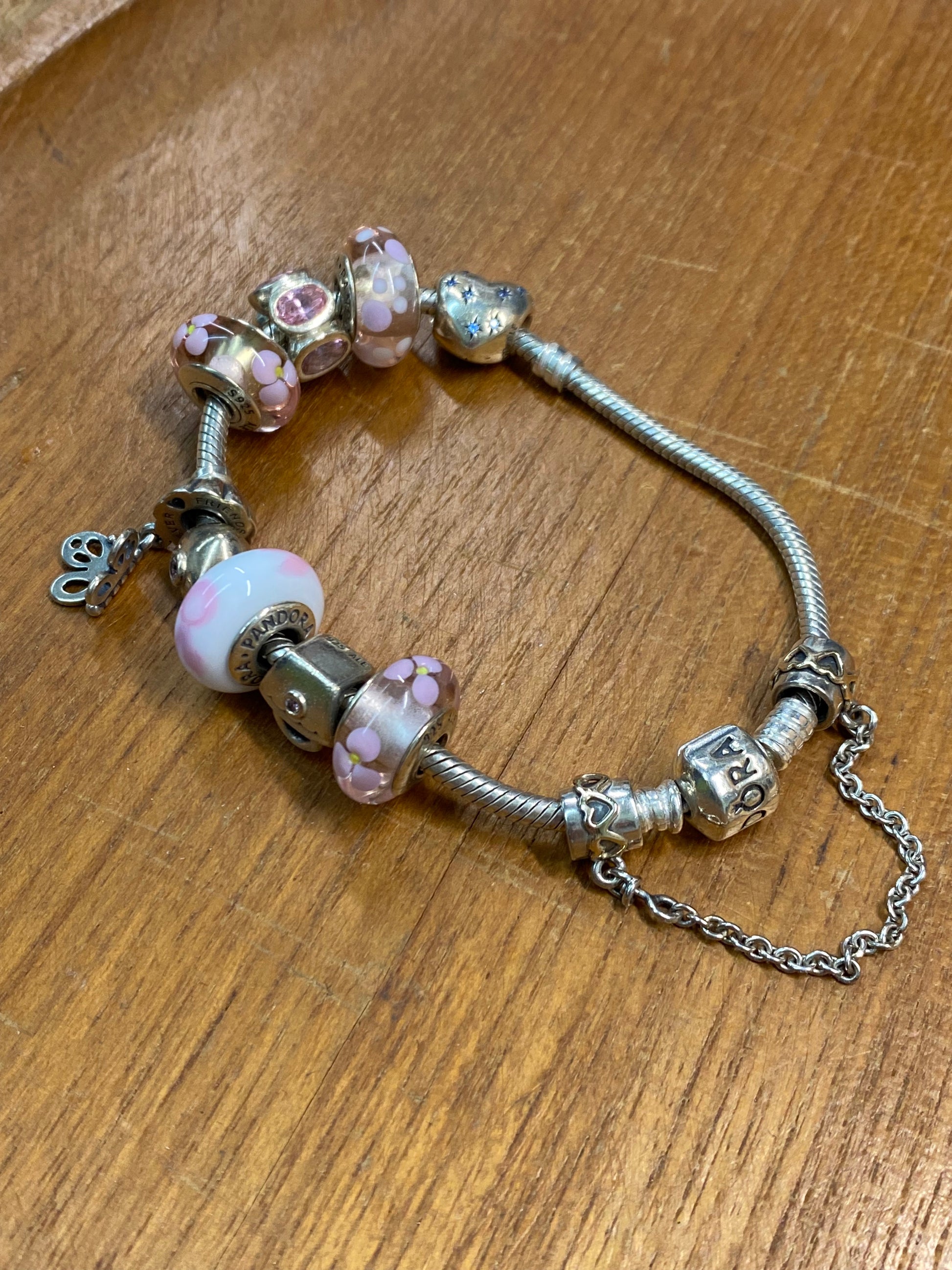 Description : Pandora sterling bracelet with locking clasp and 9 charms.