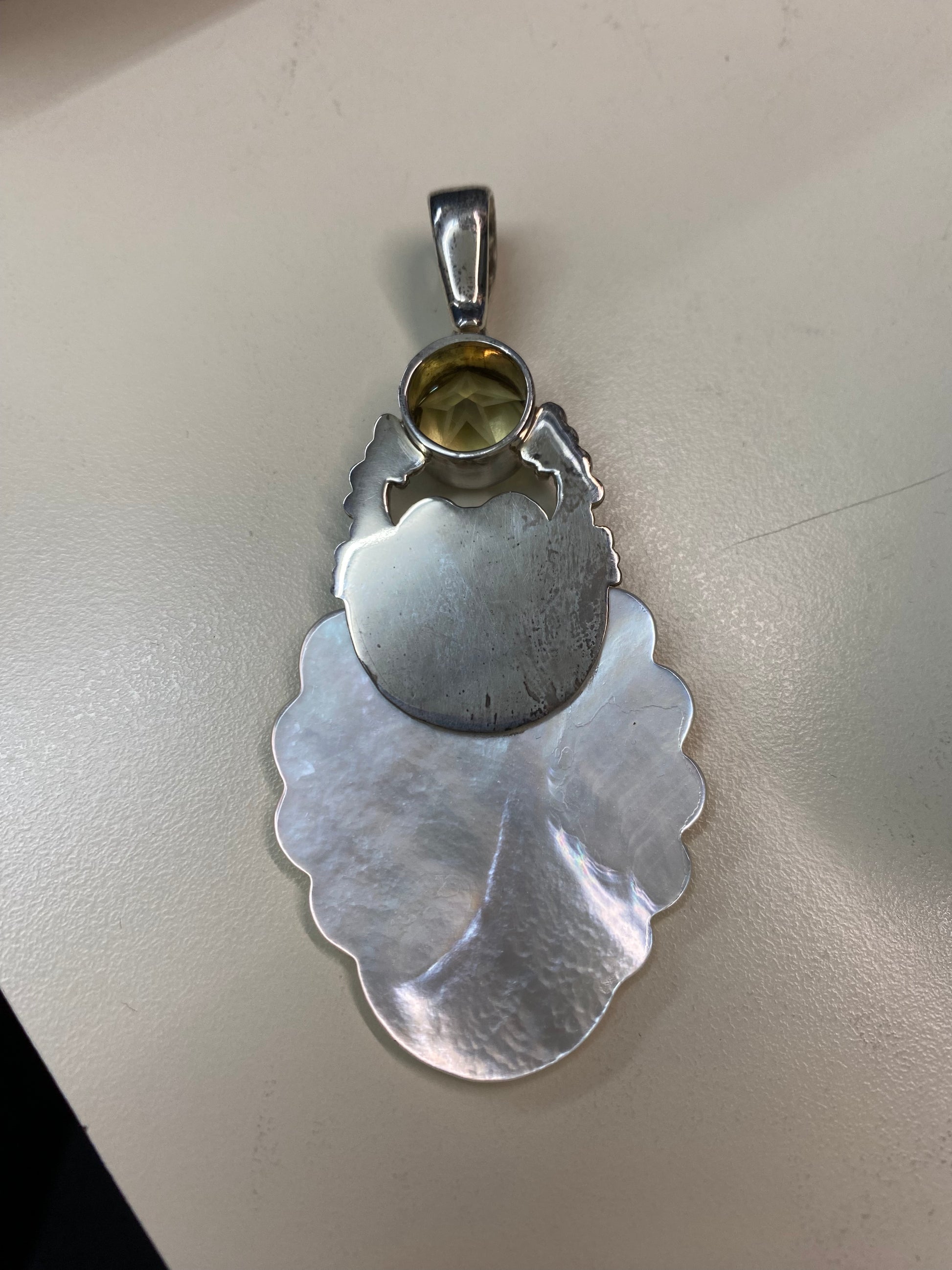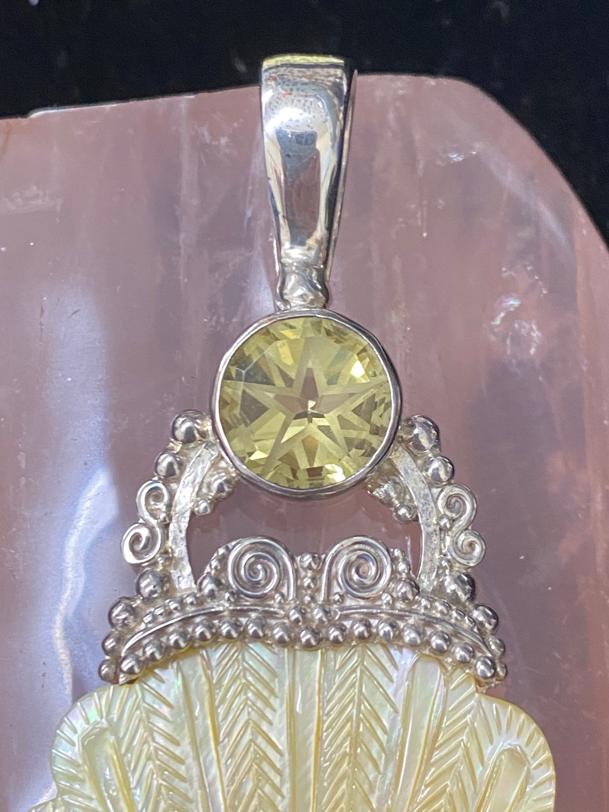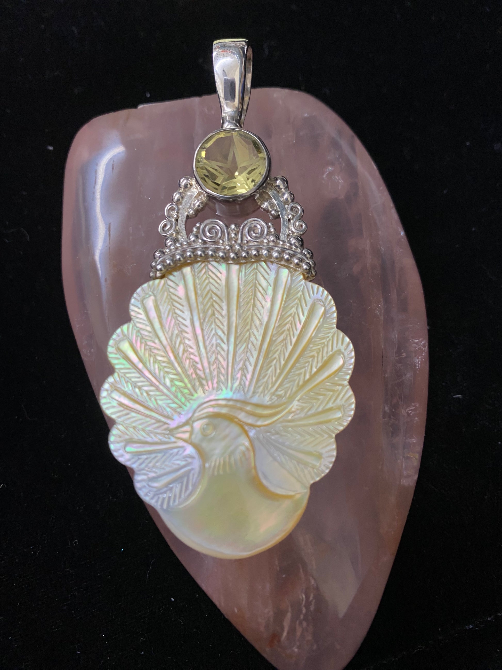 Description : Designed by SAJEN, this gorgeous peacock features hand-carved mother-of-pearl and lemon quartz, held by 925 sterling silver. Pendant only. SAJEN carved pandants sell online for up to $200 used.